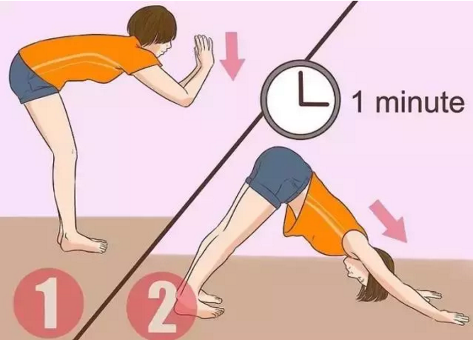 从站姿开始,上身慢慢向下伸展直到触到地面,同时保证双腿和上半身属于绷直状态,坚持一分钟可以很好地伸展开脊椎。