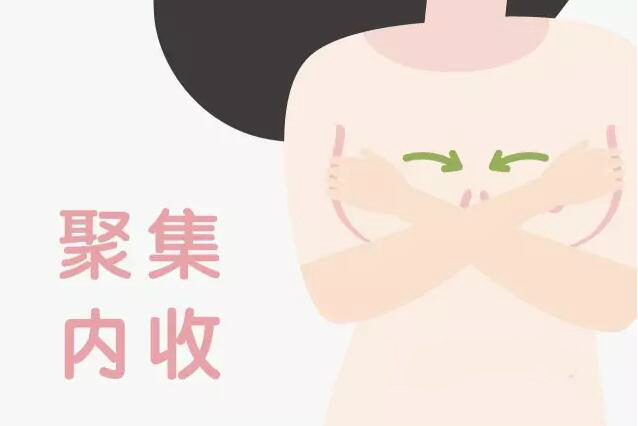 岔开右手五指(不要并拢)将四指放于左胸的外侧,大拇指放于胸部上部,总的来说是将胸部“包裹”起来,再轻轻向内部拉收。左右各重复10次