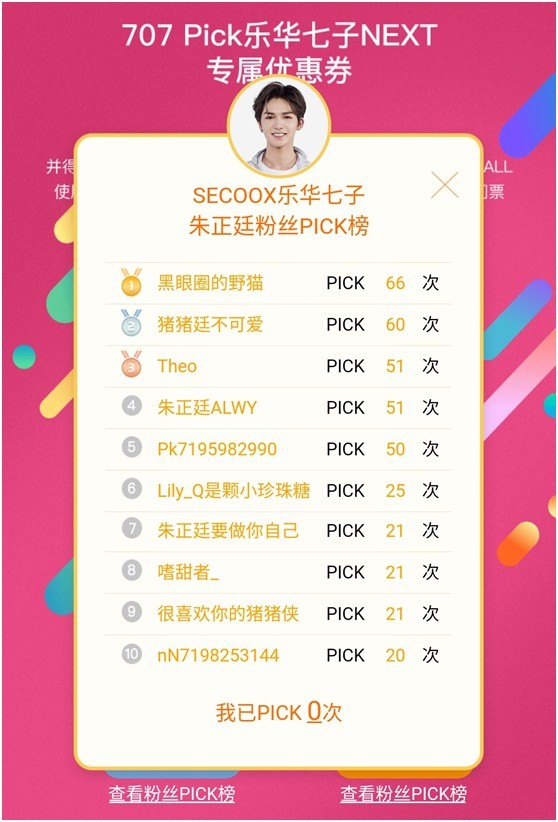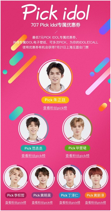 乐华七子NEXT粉丝们Pick idol专属优惠券,最低7元PICK IDOL偶像专属满707减100元优惠券,同时也可以获得乐华七子NEXT专属高清电子壁纸,每天可以多次PICK,为你的IDOL打CALL,使用优惠券更有机会获得7月21日乐华七子NEXT上海粉丝见面会门票。