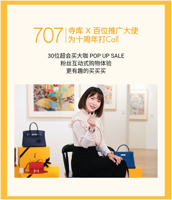 寺库707周年庆X百位推广大使为十周年打Call,这些超会买大咖POP UP SALE将与粉丝提供互动式购物体验,寺库通过线上线下场景体验和服务互动的优势,能给消费者提供场景化、沉浸式的消费体验,实现零售行业的价值链重塑,让你更有趣的买买买,乐享购物。