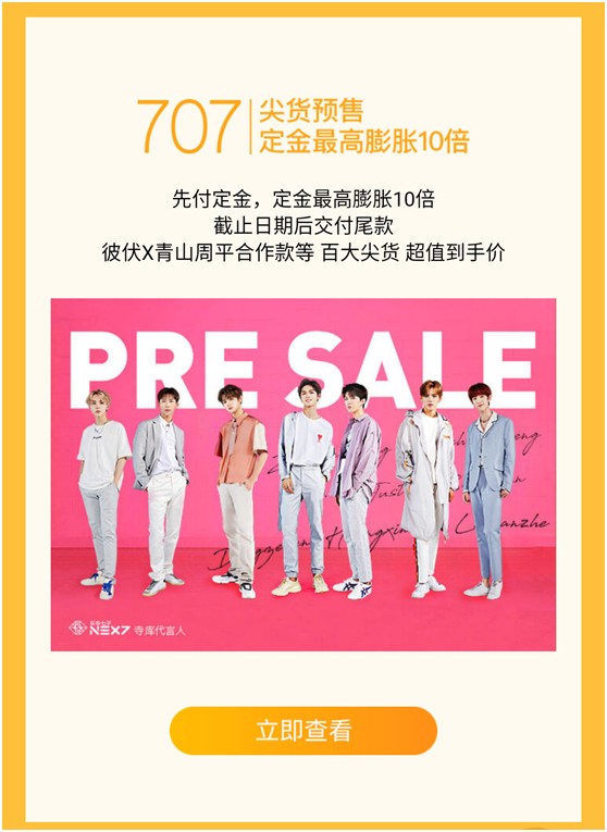 寺库707尖货预售,你只要先付定金,定金会根据详情页提示倍数膨胀,最高膨胀10倍,抵消金额可在支付尾款时候减去,百大尖货,超值到手价,你还在等什么?