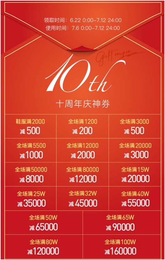 寺库十周年为你准备了价格不等的神劵:鞋服满2000减500,全场满1200减200,全场满3000元减500等等,最高神劵可以减160000元,这么大的优惠你还在等什么?