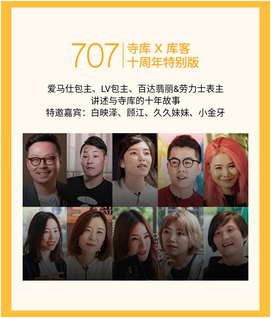 寺库707周年庆X库客十周年特别版,爱马仕包主、LV包主、百达翡丽与劳力士表主讲述与寺库的十年故事;特邀嘉宾有:白映泽、顾江、久久妹妹、小金牙,我们一起来听听他们与寺库的故事吧。
