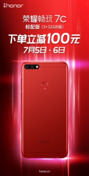 自2018年3月发布以来,荣耀畅玩7C凭借5.99英寸全面屏、1300万后置双摄、人脸识别等7项实用卖点赢得消费者的青睐,连续夺得4月、5月安卓手机线上销量价位段冠军。好消息来了!7月5日到6日,凡是购买荣耀畅玩7C标配版(3+32GB)下单立减100元,799元即可将这款百元爆品带回家,优惠力度空前。