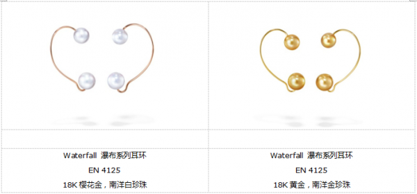 Waterfall瀑布系列由有机的曼妙弧线与笔直、形象的线条共同织就,18K白金和钻石刻画了水流倾泻入宽广海洋的场景,伴随着樱花金散发出的光芒,如同温暖的阳光照亮了瀑布与海洋。