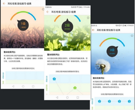 这款耳机不仅仅是检测心率、给出心晴指数这么简单。针对不同指数和场景,还能提供多种专业减压方案和反馈式减压训练。其将放松训练分为3级,分别是一般放松(1级)、较好放松(2级)和充分放松(3级),放松训练结束之后,耳机还会再次进行检测,以评估实际效果。