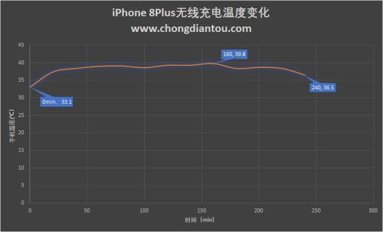 上图为iPhone 8Plus无线充电时的温度变化,可以看出,整次充电,iPhone 8Plus的温度在35.9℃~39.8℃之间徘徊,使用FLIR测温仪测得在充电160分钟时(2小时40分钟)温度达到39.8℃。在第240分钟(4小时)测得温度为36.5℃。