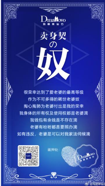 玛丽莱为什么要鼓励女性测试另一半的奴性指数?这源于玛丽莱大胆犀利的“为爱奴役”品牌价值观。作为全球首个为女性发声的品牌,Dmallovo(玛丽莱钻石)以「爱的卖身契」作为品牌主张,鼓励女性追求更大幸福权,无论爱情还是生活。莎翁说,爱情是一种疯,而Dmallovo说:真爱是一纸不平等条约,是一方的占有和另一方的放弃,是男性签下卖身契,三权放弃,被爱奴役,爱到极致,忘记自己。