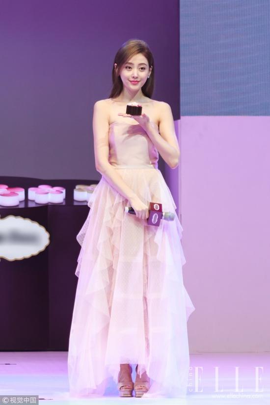 张天爱这条粉色抹胸裙大走优雅路线,自腰部展开的荷叶边层层落下营造出层次感。