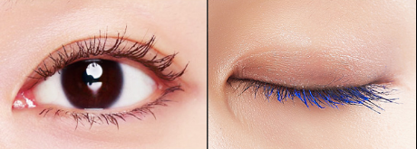 首先,用瓷妆幻彩纤密双色睫毛膏的黑色大头呈Z字型横向轻刷所有睫毛,再用蓝色小头横向轻刷睫毛中部至末端,打造双色幻变眼妆。