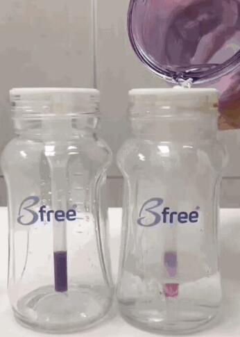 而Bfree奶瓶,瓶内水温度高于37°C(绝大多数的奶粉冲调推荐温度为37°C)时,瓶身就会由紫色向粉色逐渐转淡,而当水温低于37°C时,瓶身又会逐渐恢复为紫色。