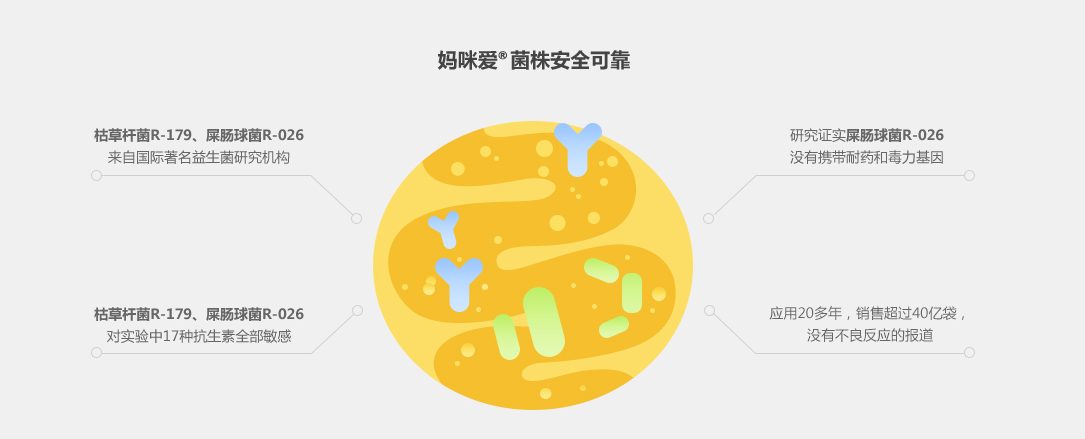 妈咪爱益生菌每1袋中含1.5亿活菌,能很好地帮助宝宝改善消化不良、治疗腹泻、便秘等肠道问题。因为宝宝便秘、腹泻的时候,肠道内的有益菌被大量破坏,有害菌迅速繁殖,因此给宝宝及时服用妈咪爱等益生菌,快速”恢复”肠道内的生态秩序,是对宝宝病情有利的。而且妈咪爱益生菌中的枯草杆菌菌体自身还能合成α-淀粉酶、蛋白酶、脂肪酶、纤维素酶等,非常有利于肠道系统内的营养消化吸收。作为好氧和兼性厌氧的菌种,枯草杆菌能够促使局部环境的氧分子浓度降低,从而促进厌氧微生物的生长,达到肠道菌群生态平衡的目的。