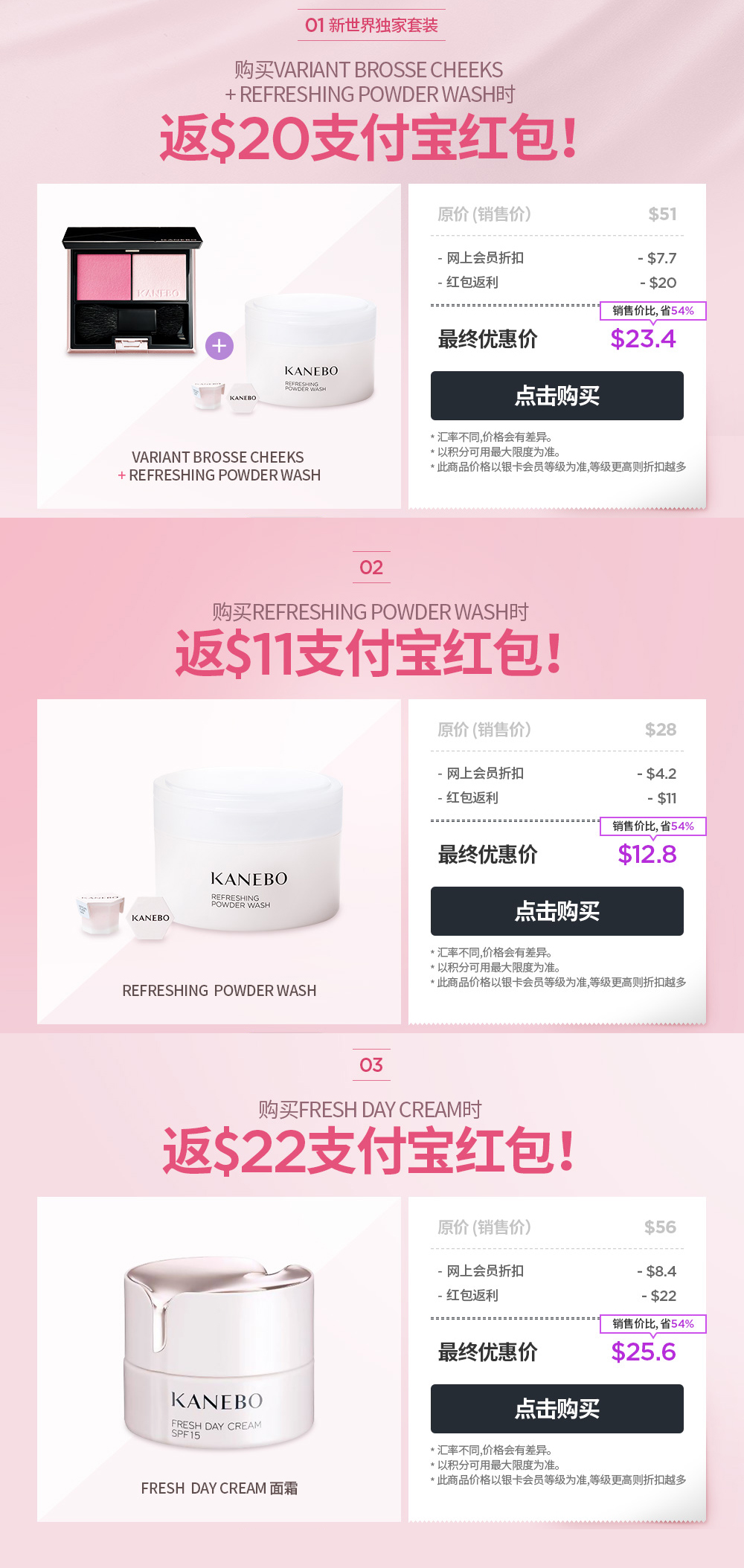 为了获得高效持久的护肤效果,佳丽宝护肤产品均采用自然精华为原料,以“时间美容”为概念,遵循“一天”、“一个月”、“一年”的生物节律采取相对应的护肤策略。特别是REFRESHING POWDER WASH 是日本Cosmetic 美妆品牌大会中蝉联第一的人气产品,不仅在日本深受国民喜欢,也吸引广大到日本旅游的海外消费者们,一度成为游客必买美妆品。