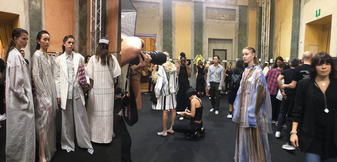 米兰秀场上,中国品牌的参与度一季高过一季。首登国际舞台的JESSIE十分珍惜与大牌同场竞的机会,为米兰大秀精心筹备数月,反复修改方案,做好最精心搭配。设计顾问Federico Piaggi先生更是为米兰downtown时髦人儿解放双脚,在大秀前夕特别设计了皮具编织鞋。大秀后台,模特的妆容、整体造型设计,衣服,鞋子,配饰等逐一按计划一丝不苟搭配,力求最好地表达设计。