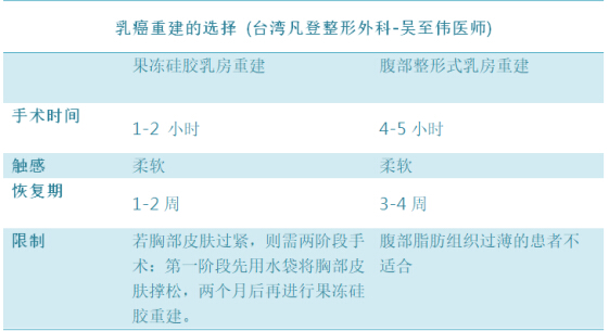 如果患者本身对于外来异物有排斥感,则可考虑腹部自体组织乳房重建,吴至伟医师进一步指出,此手术的好处是乳房触感更为自然,胸部皮肤可恢复大部分的感觉,而因为腹部皮瓣切除能同时达到腹部紧实效果,对许多乳癌病友带来对身材的自信,又可称之为「腹部整形式乳房重建」。因此面对乳癌,国人应积极检测与以正面态度看待重建手术,减轻乳房切除带来的强大心理压力。