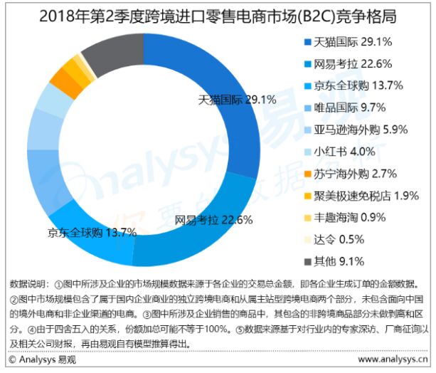 从市场表现来看,天猫国际无疑是跨境电商平台的佼佼者。2017年,天猫国际以58.2%的知名度位列各跨境电商平台之首;2018年第二季度,天猫国际以29.1%份额保持市场规模第一,同时在跨境新零售模式创新值得关注。