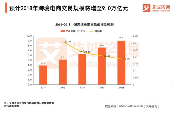 iiMedia Research(艾媒咨询)数据显示,截止2017年底,中国跨境电商整体交易规模(含零售及B2B)达7.6万亿元人民币,海淘用户规模已达0.65亿人,预计2018年跨境电商交易规模将增至9.0万亿元人民币,海淘用户规模将达0.88亿人。