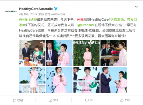 几个月前,孙俪曾到访悉尼参签约仪式,正式宣布成为Healthy Care 的品牌代言人,这让许多网友相信,娘娘孙俪保持青春靓丽容颜的秘诀就来自Healthy Care的美容保健品。孙俪也现场为这个澳洲国民保健品品牌打call, 产品品质好自己吃到肚子里或推荐给朋友亲人们才会放心。Healthy Care的葡萄籽胶囊是被许多种草达人疯狂推荐的一款美容养颜抗老化产品,只要持续长期服用,对皮肤和身体有极大的改善作用。