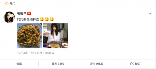 你还不知道Healthy Care的白藜芦醇口服液?那你总知道“最美李莫愁”“新婚军嫂”张馨予吧。10月25日,微博热搜女王张馨予一条葱油拌面的微博又冲上热门。她在微博晒出了一张葱油拌面的照片还有自己与葱油拌面的合影,并附言“妈妈的葱油拌面