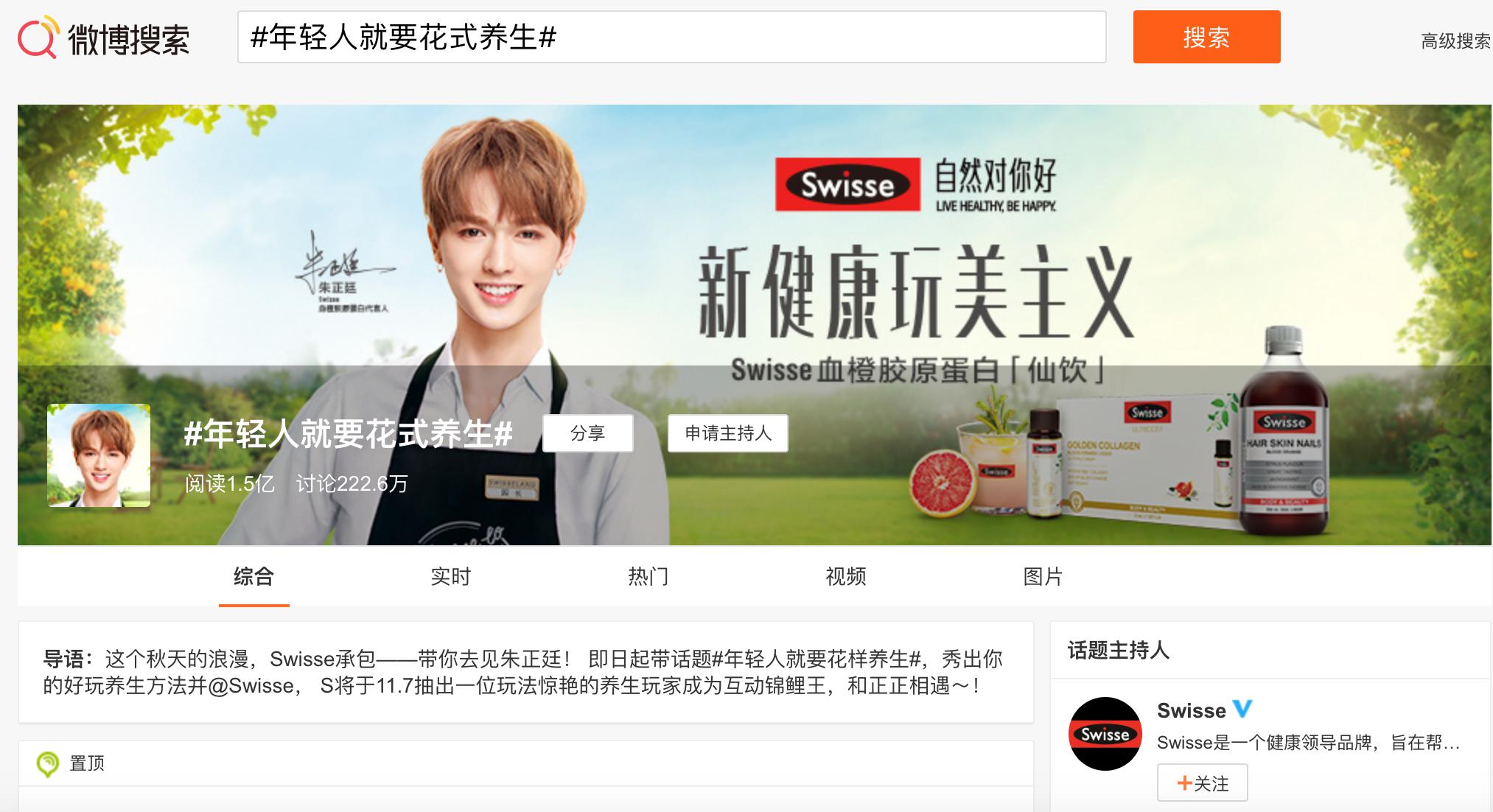 这次Swisse在双11期间借机推出新品Swisse血橙胶原蛋白精华,并宣布人气偶像朱正廷成为血橙胶原蛋白精华代言人,通过精准触达,吸引到目标受众的热情关注。 “年轻人就要花式养生”这话题在短短几天内,火速蹿上微博热搜,话题阅读量破亿,纷纷撬动电商、健康、娱乐等领域的跨界关注。