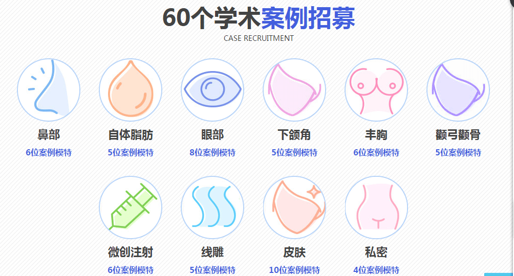 招募涉及鼻部(6位案例模特)、自体脂肪(5位案例模特)、眼部(8位案例模特)、下颌角(5位案例模特)、丰胸(6位案例模特)、微创注射(6位案例模特)、线雕(5位案例模特)、皮肤(10位案例模特)、私密(4位案例模特)一共60位学术案例模特。