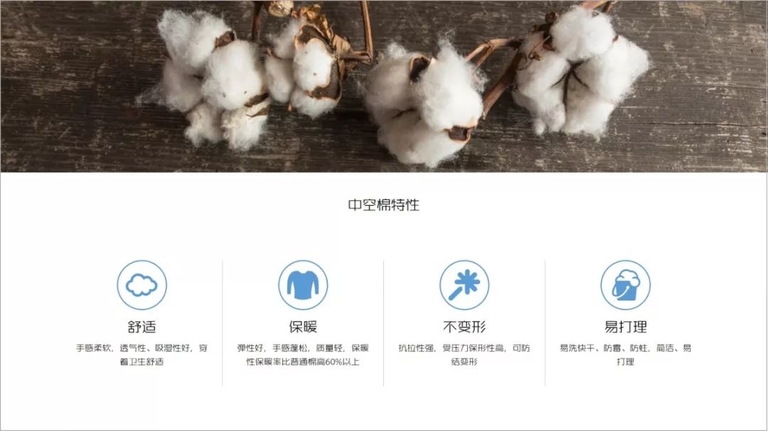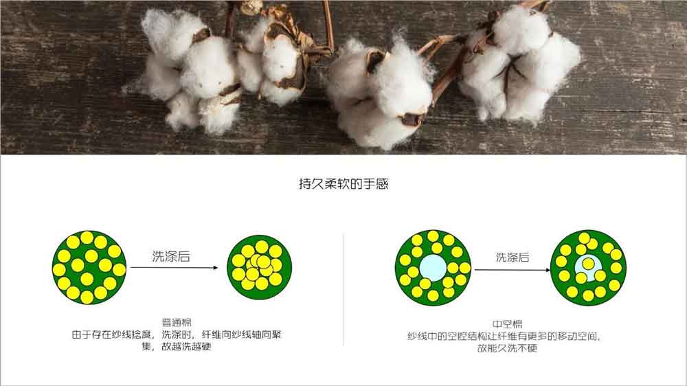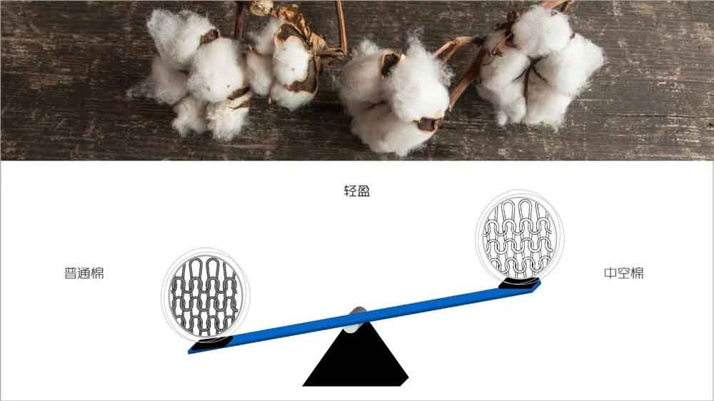 更神奇的是,中空棉的柔软触感并不会因多次洗涤而消褪,区别于化纤的越洗越硬,中空棉得益于纱线中的空腔结构,让纤维有更多的移动空间,就算多次洗涤之后,依然能够保持柔软的手感。
