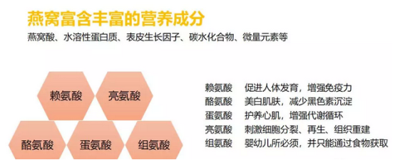 现代科学研究表明:1000克干燕窝中含有蛋白质499克、钙429毫克、碳水化合物306克、磷30毫克、水分104克、铁49毫克。值得一提的是,燕窝中的蛋白质主要是水溶性蛋白质,与其它蛋白质相比,水溶性蛋白质更容易被人体消化吸收,成年人每天吃3-5克的干燕窝,消化吸收的营养量等于一日三餐所提供的营养量。燕窝对于急需补充身体营养的人作用巨大。