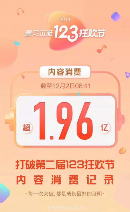 喜马拉雅“123狂欢节”是喜马拉雅为倡导重视知识价值发起国内首个内容消费节,今年已是第三届,本次狂欢节的持续时间为11月23日到12月3日,据统计,截止12月2日的8点41分,销售额超过1.96亿,突破了2017年全年的销售额。