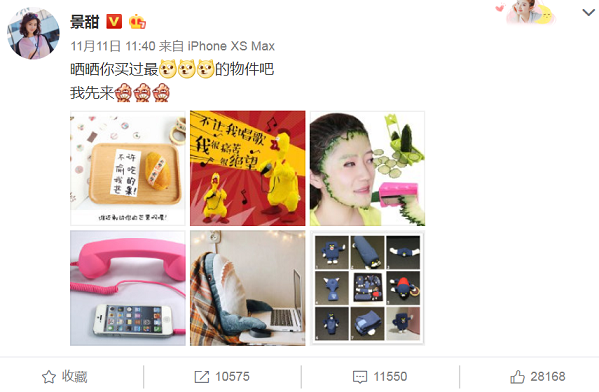 双十一当天,占有小红书“半壁江山”的斜杠明星“美妆博主”景甜,在微博晒出自己的购物清单,其中就有黄瓜切片神器。对比很多朋友圈晒清单中国际大牌护肤品的小仙女们,景甜这件单品可以说很接地气了。