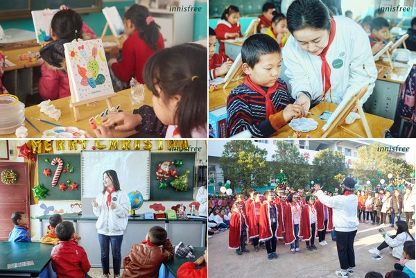 每年的12月,innisfree悦诗风吟在中韩两国同步发起“Green Christmas绿色圣诞节”项目,旨在将实实在在的公益关爱之心送到孩子们身边。绿色圣诞节是以“手作、欢愉、分享”为主题和大家一起分享幸福的爱心活动。2013年起,悦诗风吟与上海宋庆龄基金 会携手捐助“悦诗风吟绿色爱心图书馆 ”,并于12月发售悦诗风吟绿色圣诞节限量产品及DIY手作,将手作销售收入捐至上海宋庆龄基金会爱心书库项目,将阅读的乐趣带给中国偏远山区的孩子们,让他们养成良好的阅读习惯,感受阅读的快乐,从书籍中获取成长所需的知识与力量。2018年,悦诗风吟将向安徽的五所小学* 捐助10000册全新的图书建立“悦诗风吟绿色爱心图书馆”。