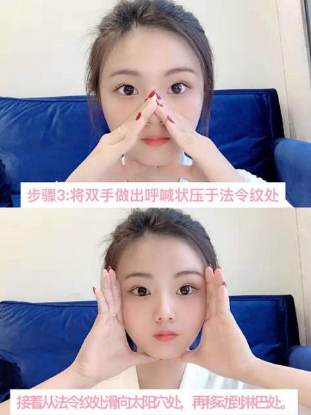 3、将双手做出呼喊状压于法令纹处,接着从法令纹处滑向太阳穴处,再移动到淋巴处。(看图2)