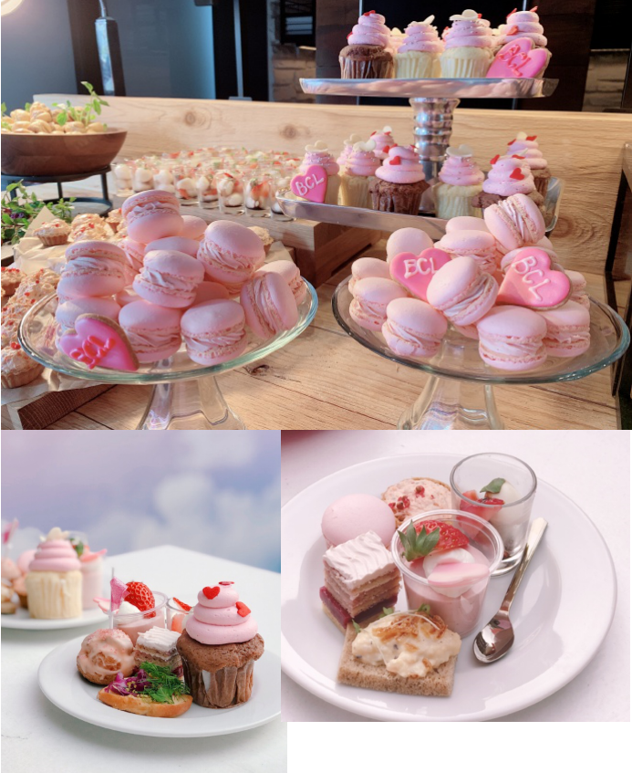跟着镜头转过来,下午茶的自助餐台也是一片粉,草莓杯、小纸杯蛋糕、马卡龙,爱心小饼干,小仙女们拍摄美食的技术也是很服气的。