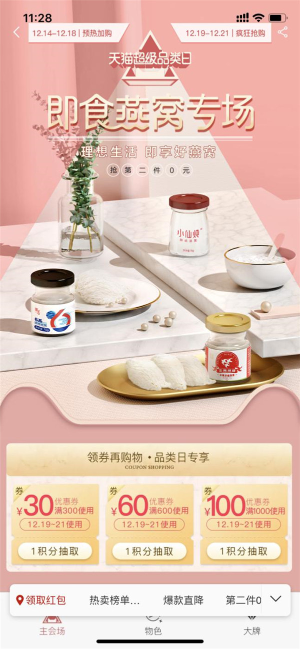 天猫超级品类日即食燕窝专场活动仍在进行中,国内外的头部燕窝品牌都拿出了主推产品。用户可抓住最后两天的机会,通过手机淘宝/天猫搜索“超级品类日”到达会场页,享受专场活动专场优惠。
