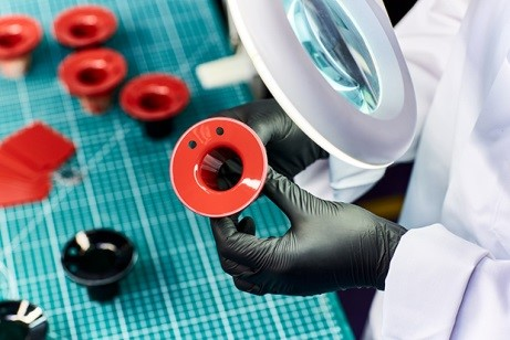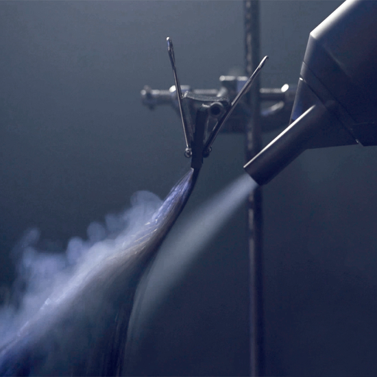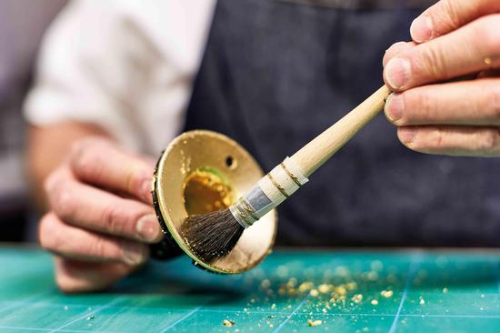 在研发过程中,戴森工程师通过操控涂漆机械臂将精准控制的粘合剂喷涂到端盖表面上。为覆盖金箔创造理想的条件,该粘合剂的厚度、涂覆和干燥时间必须予以精微控制。机械臂确保每一个金面均达到独特且无瑕的完工处理。喷涂完成后,用刷子仔细手工贴附来自意大利佛罗伦萨的金箔,精妙程度难以置信,并且必须手工贴附。贴金过程中,每件产品需要用到五片金箔,接着再仔细刷合,形成光滑而均匀的表面。