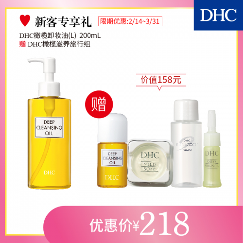 2月14日-3月31日,DHC推出新客专享明星装优惠活动,买200ml DHC橄榄卸妆油送30ml卸妆油、洁面皂、化妆水、精华油与礼品袋多重好礼,原价合计376元的产品只需218元优惠价。致敬真爱,优享好礼!