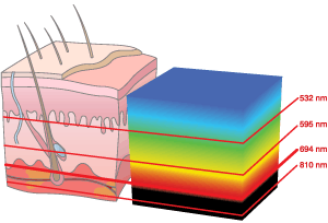 波长575纳米的橙光和红光则能深入作用于毛囊生长的真皮层