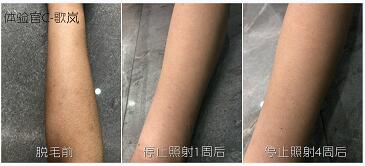第二张图拍摄于结束疗程一周后,整条手臂都很光滑,体毛生长明显得到控制。而第三张图拍摄于结束疗程4周后,这时毛毛陆续又长出来了,说明脱毛还不够彻底,需要增加疗程。