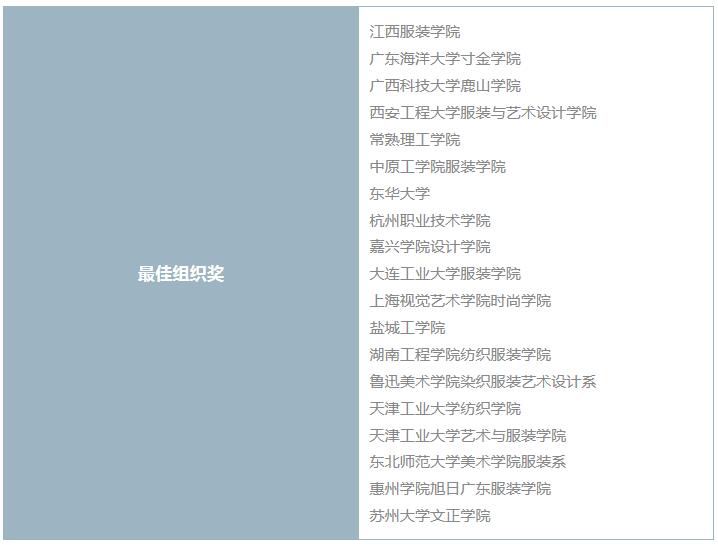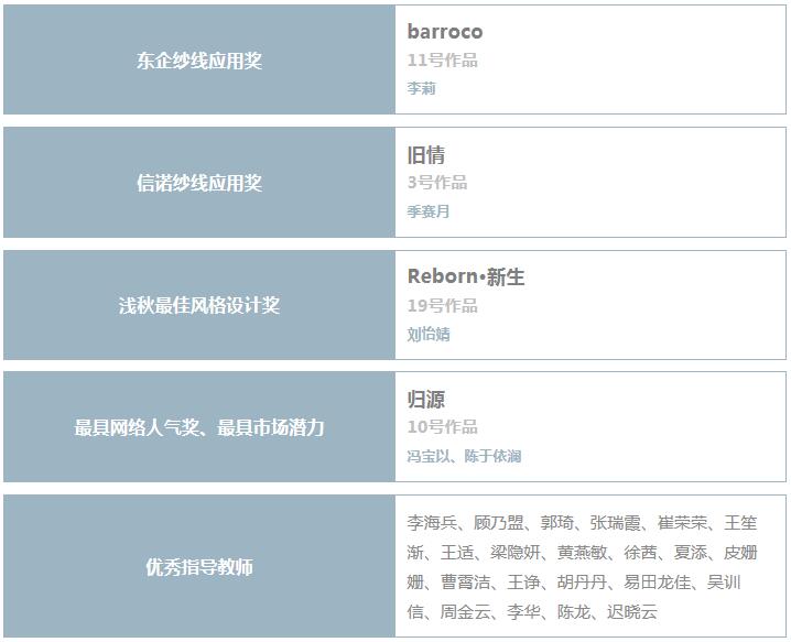 最终,选手冯宝以、陈于依澜凭借作品《归源》斩获大赛一等奖,选手刘怡婧、李莉凭借作品《Reborn·新生》和《barroco》分别摘得二等奖,选手邓安棋、史聪聪、张翼飞分别凭借作品《以痛吻我》、《墨染》、《生声》获得三等奖。同时,经过一周的网络票选,冯宝以、陈于依澜还以30366票的成绩斩获了“最具网络人气奖”和经现场观众投票产生的“最具市场潜力奖”;14组选手获得优秀奖。