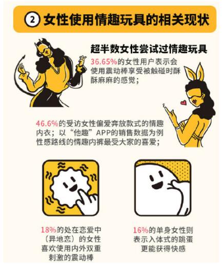 在情趣玩具的使用情况方面,调查显示超半数受访者都尝试过情趣玩具。36.65%的受访女性表示会使用震动棒,享受被触碰时酥麻的感觉。46.6%的受访女性偏爱奔放款式的情趣内衣,以“他趣”APP的销售数据为例,性感路线的情趣内裤最受大家的喜爱。18%的处在恋爱中(异地恋)的女性喜欢使用内外双重刺激的震动棒,16%的单身女性则表示入体式的跳蛋更能获得快感。37%的女性希望尝试能够尝试老师、警察、护士等角色扮演增加过程中的刺激感。性经验较少的女性则表示希望通过催情润滑类情趣商品,来缓解之前性体验过程中带来的紧张与不适。