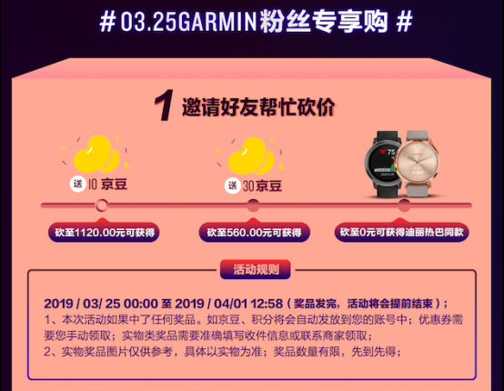 3月25日至3月29日,Garmin邀请好友齐助阵!邀请您的好友帮忙砍价,可获得京豆奖励,砍至0元可直接将Garmin迪丽同款腕表抱回家!