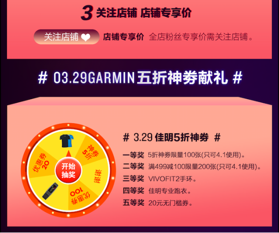 除了砍价和签到活动,作为您的贴身管家,Garmin还贴心为您准备了转盘抽奖活动!3月29日至4月1日,Garmin(佳明)五折神劵献礼!每人每天赠送一次抽奖机会,动动手指,分享他人即可再次获得一次抽奖机会!奖品种类繁多,多到让您眼花缭乱!