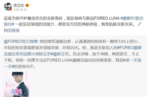 不仅如此,作为品牌代言人的人气IDOL陈立农也是早早地便在微博为LUNA3V脸洁面仪的宣传造势。而同样作为此次FOREO UFO面膜仪系列代言人的超人气全能偶像陈伟霆更是在发布会现场惊喜现身,引得现场迷妹们惊叫连连,线上刷屏也是应接不暇。