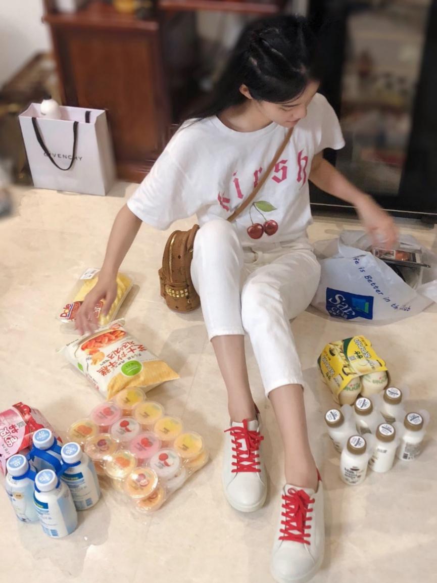白T、白裤和白鞋搭配组合,T恤上的红色字母和图案跟小白鞋的红色鞋带呼应,成功化解了单调,富有趣味,活力十足。博主ttwenya穿这样逛超市,也太养眼了吧!