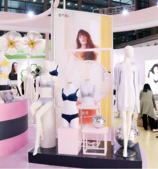 国际品牌内衣展静态展示现场,再现网红打卡圣地——都市丽人Gen-X旗舰店,以全新的视觉形象,带着专属于自己的时尚特色风潮在众多展点中脱颖而出,简约的线条设计和曲面结合,在有限的空间里将时尚感放到最大,营造一种低调奢华的感觉。