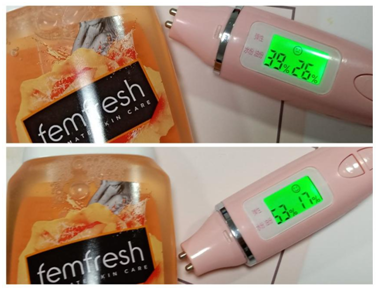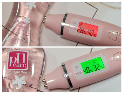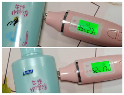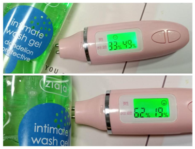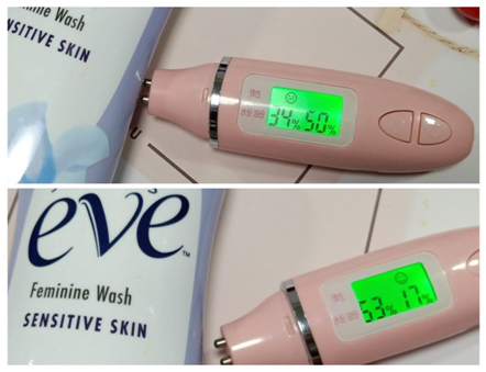 ABC私处护理液,使用前水分值是40%,使用10分钟后是45%,提升5%,基本无补水能力。