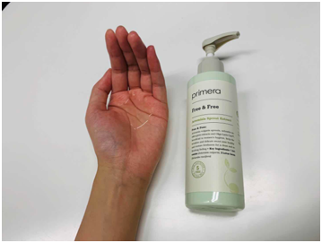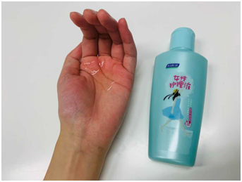 Primera私处洗液挤出来是无色透明的凝露,黏性一般化,有淡淡的柠檬香味,味道比较好闻。