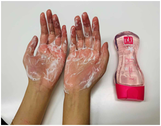 PHcare 私处洗液,摩擦后可以看到乳化的效果,但量较为稀少,且为液态,乳化能力一般。