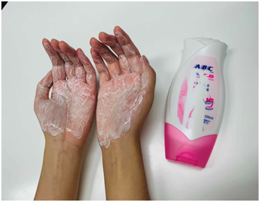 ABC私处护理液,白色的乳浊液,搓后成为乳白色的凝胶,起泡是不明显,但体积是比此前大了,乳化能力一般。