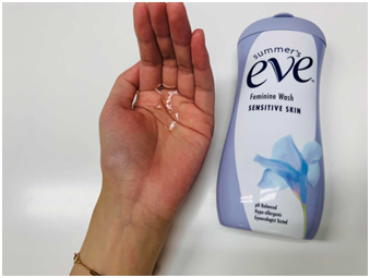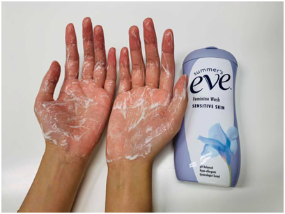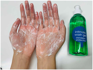 femfresh私处洗液,摩擦的时候手掌热得很,10秒后洗液成块了,量有增多,但不是很明显,乳化能力一般。