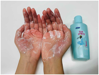 洗液乳化程度的好坏直接影响产品的清洁能力和使用感。我们采取干手摩擦打泡的方法来测试,免得在手心的水不均匀,影响结果。